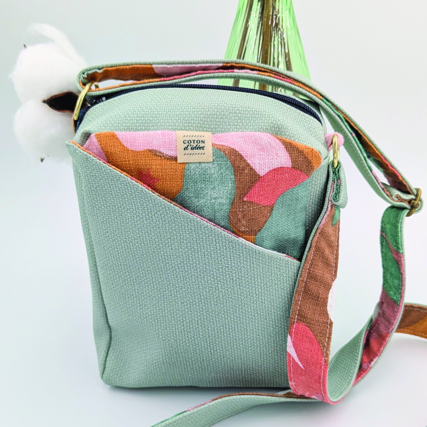 Coton – Simili cuir – Demi-anneaux et coulisse en métal – Fermeture et curseur en polyester